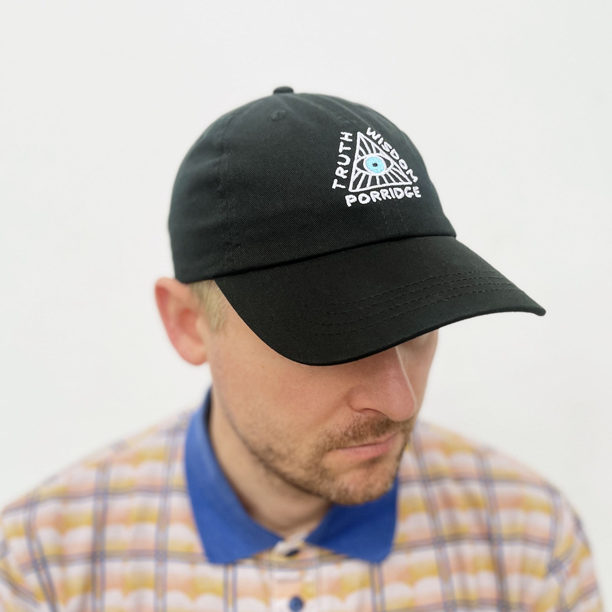 A black dad cap with the artwork Truth Wisdom Porridge embroidered in white and the mysterious All-Seeing Shrigley Eye in blue.